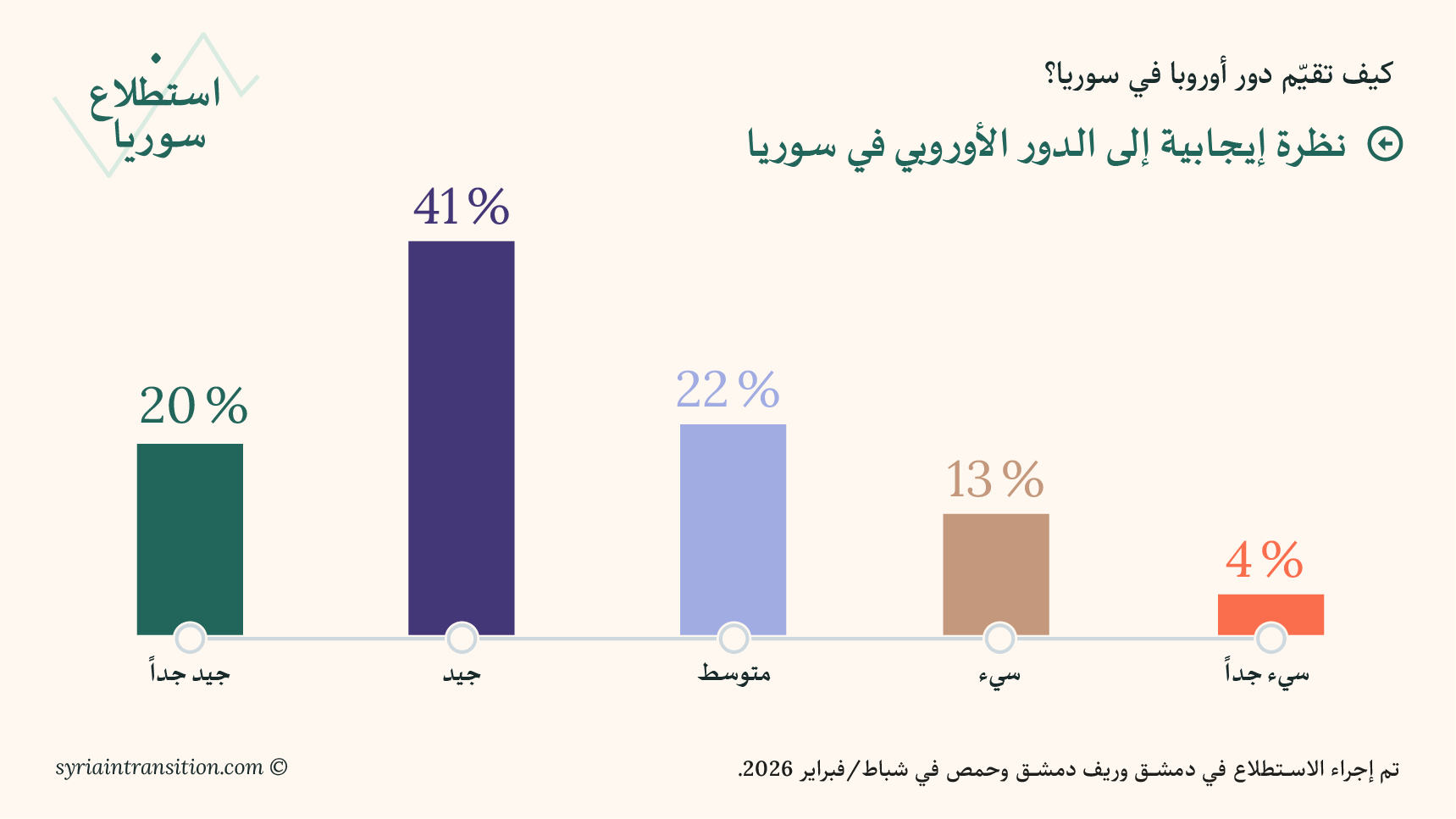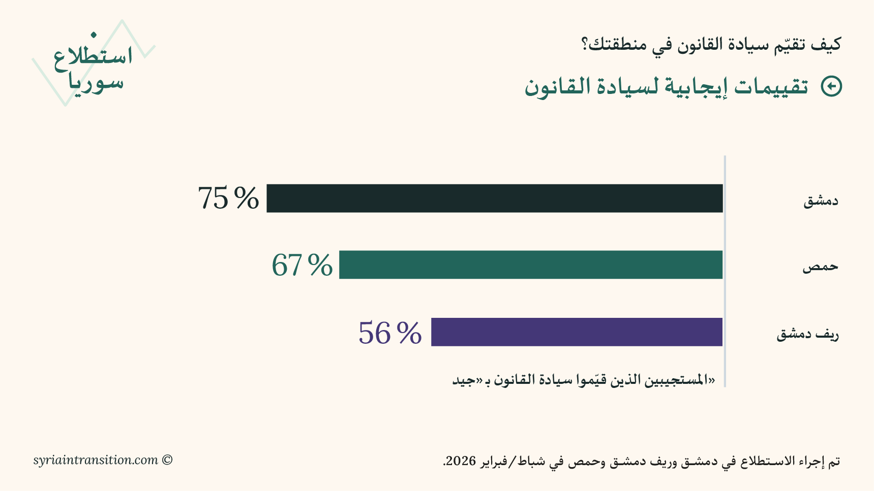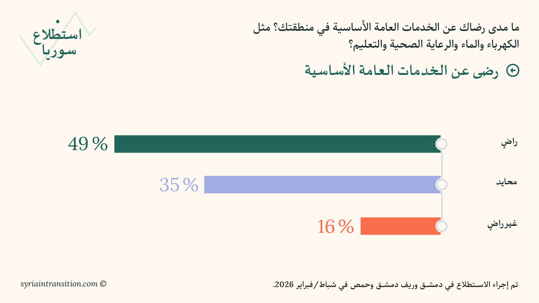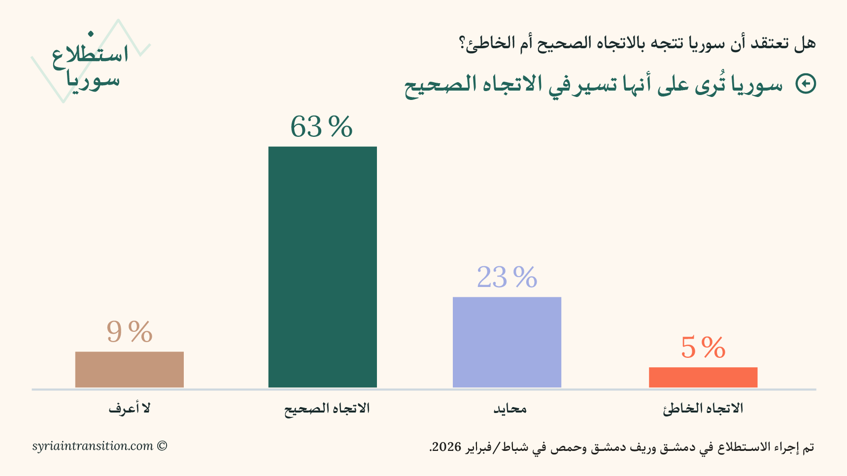 مرحبًا بكم في العدد الأول من استطلاع سوريا. يعرض هذا العدد الافتتاحي نتائج استبيانات أُجريت في دمشق وريف دمشق وحمص في أوائل شباط/ فبراير 2026، بهدف قياس تقييم السكان لظروفهم المعيشية، وأداء الحكومة، والتطورات السياسية الأخيرة.